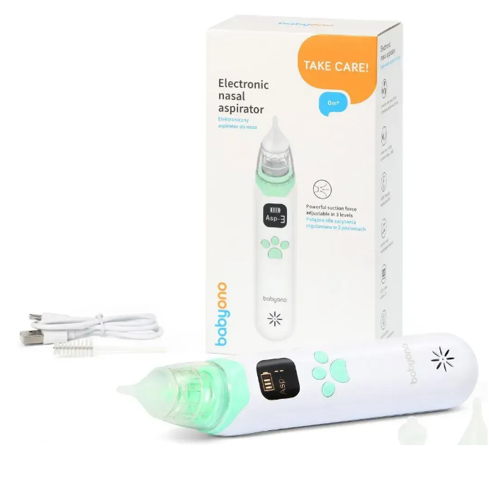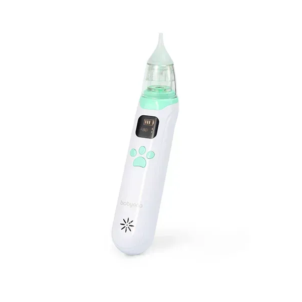 Ергономічний і тихий електронний аспіратор для очищення носика від народження. LCD-екран показує рівень заряду та активний режим, USB-C заряджання забезпечує тривалу роботу, а м’яка кольорова підсвітка та вбудовані мелодії допомагають заспокоїти малюка під час процедури.