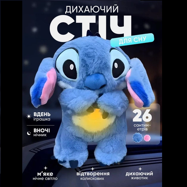 Зануртесь у світ сновидінь разом із нашою новою дитячою іграшкою для сну – “Стіч” з функцією дихання! Ця дивовижна іграшка не лише музична і розвиваюча, а й здатна створити атмосферу релаксації перед сном. З м’якою та приємною на дотик текстурою, вона принесе затишок і комфорт вашому малюку. Її м’який животик ритмічно рухається вгору-вниз, імітуючи дихання, що допомагає дитині природним чином заспокоїтися. Також цьому сприяє приємна музика, різноманітні звуки та мʼяке світло.