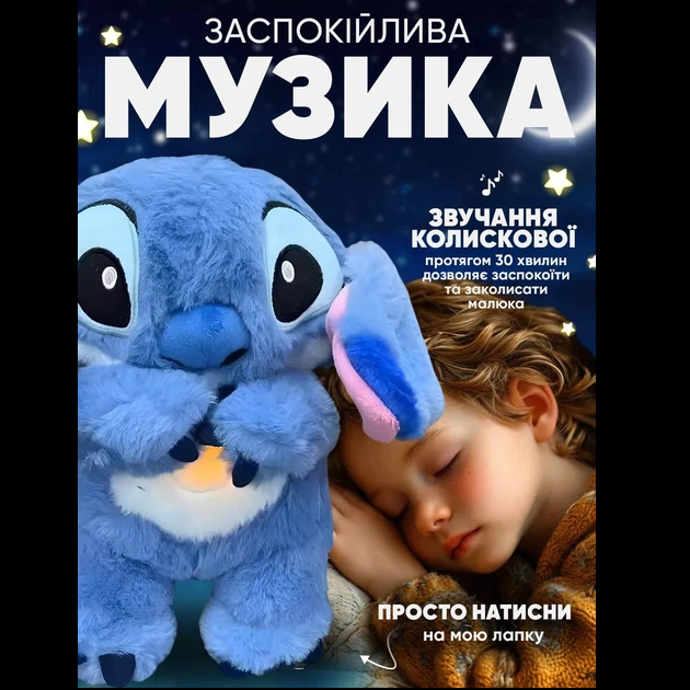 Створіть затишну атмосферу перед сном з інтерактивною іграшкою Стич — м’яким нічним другом, який допоможе дитині швидко заспокоїтися та солодко заснути. Іграшка поєднує у собі ніжну музику, ефект дихання та легку вібрацію, імітуючи присутність живої істоти. Це робить її не лише милою, а й заспокійливою для дітей.